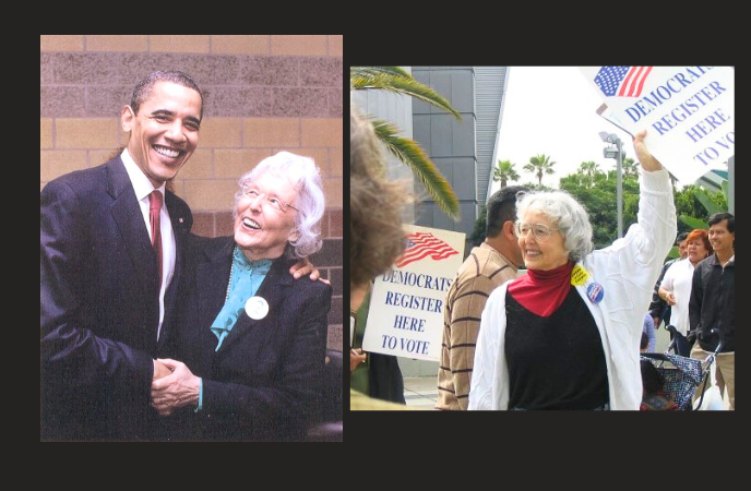 After she “retired,” Ellin Lieberman became a community leader. She knew that an active community breeds a healthy democracy, and a strong democracy enhances the opportunities for all, especially for individuals living in underserved areas. In early 2007, Ellin became an enthusiastic and committed supporter of the Barack Obama campaign. She and her husband Harry walked and traveled thousands of miles for the campaign. The President formally acknowledged them at his April 2009 Los Angeles visit.